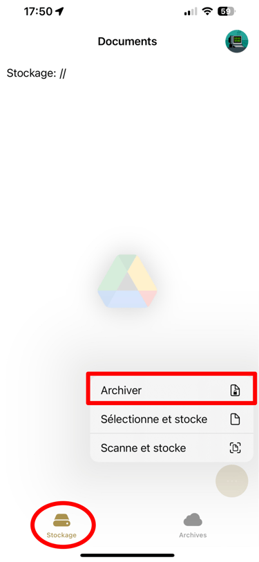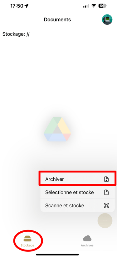 L'onglet 'Archives' affiche les documents présents dans l'espace d'archivage sur le drive.