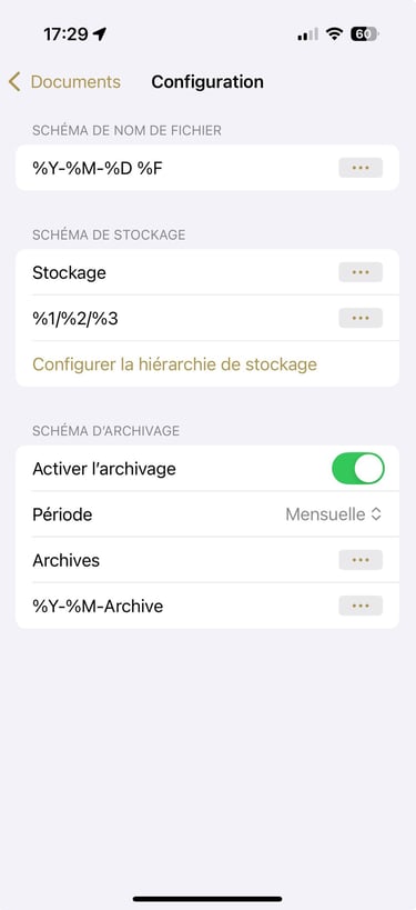 Quand l'archivage est actif, le bouton d'archivage à la demande est proposé dans le menu ("...") de l'application et l'archivage périodique est surveillé à chaque lancement de l'application.