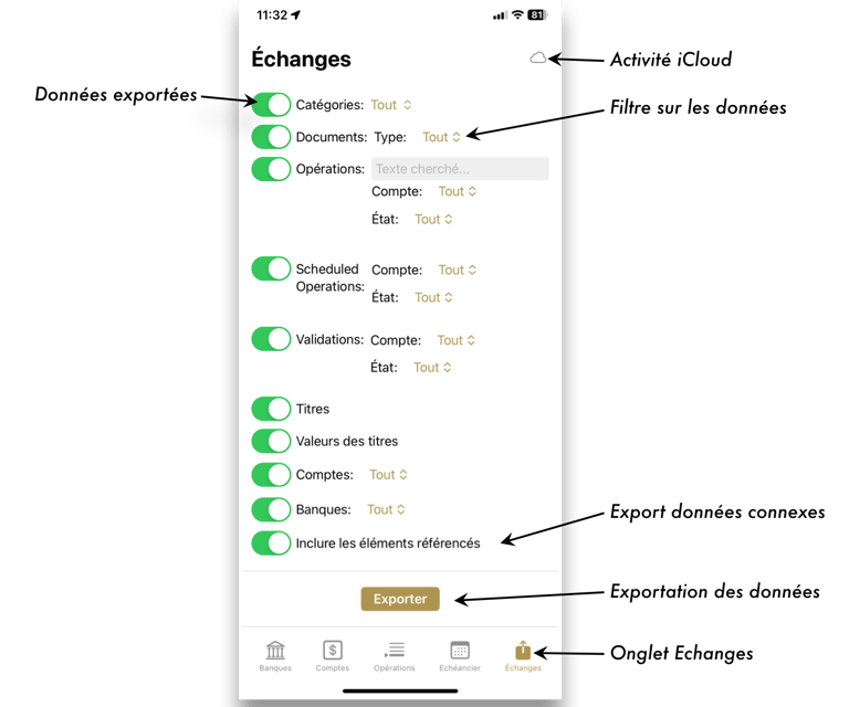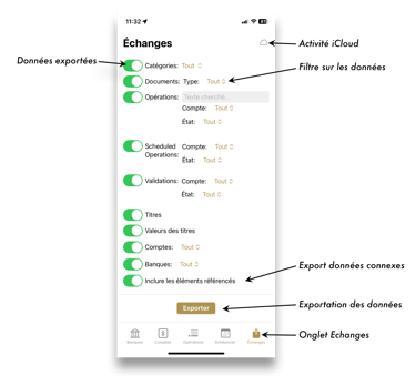 Sélectionner les données à exporter: une partie seulement des données peuvent être exportées (selon les entités et filtres appliqués).