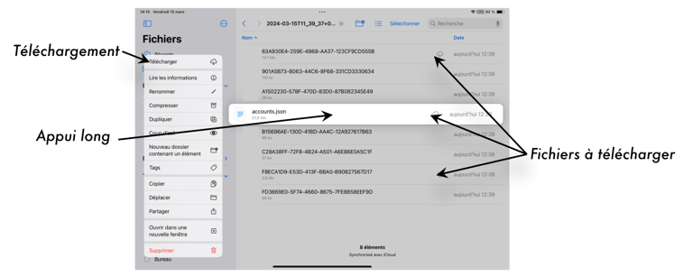 Si l'archive n'apparaît toujours pas. Aller dans l'application Fichier et vérifier que l'ensemble des fichiers sont bien téléchargés sur l'iPhone ou l'iPad. Si ce n'est pas le cas, demander le téléchargement (appui long sur le fichier jusqu'à ce que le menu s'affiche et taper sur télécharger). Revenir dans swatAccounts et rafraichir la liste des imports (🔄).